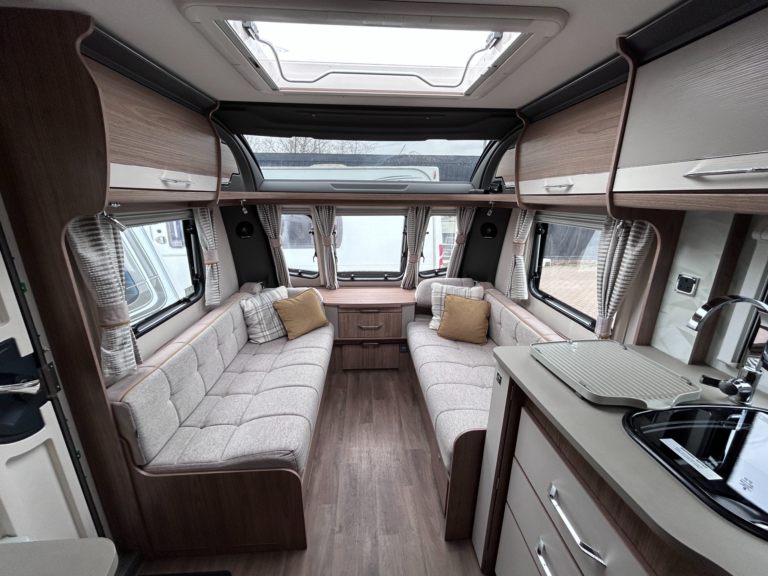 The 2018 Coachman VIP 575 is a luxurious 4 berth caravan designed for ultimate comfort and style. With its spacious layout and high-quality fixtures, this caravan is perfect for families or couples looking to enjoy a relaxing getaway. The VIP 575 features a well-equipped kitchen, complete with a fridge, oven, and microwave, as well as a comfortable lounge area that easily converts into a double bed. The rear bedroom boasts a transverse island bed, providing a peaceful and restful space for a good night's sleep. With its modern design and attention to detail, the VIP 575 offers a premium experience for those seeking a home away from home on their travels.